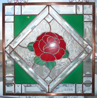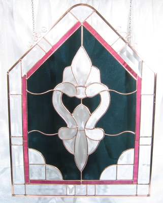 Description: Custom panel with beveled corner accents and cranberry glass accenting the cluster. Pencil bevel corners with waterglass background.