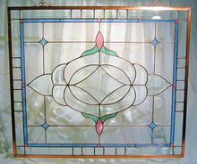 Description: Custom room divider panel with sea foam green and light mauve accents on an iridized background. The beveled glass is all gluechip textured, and the center is a brilliant cut engraved oval bevel.