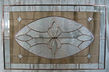 Description: Custom panel with beveled center cluster surrounded by irridized ripple glass, bronze color background. Beveled star accents at the four corners and a beveled border.
