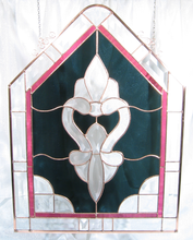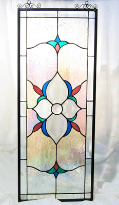 Description: Custom panel with jewel tone accents around beveled glass. Beveled border and textured iridized glass background.